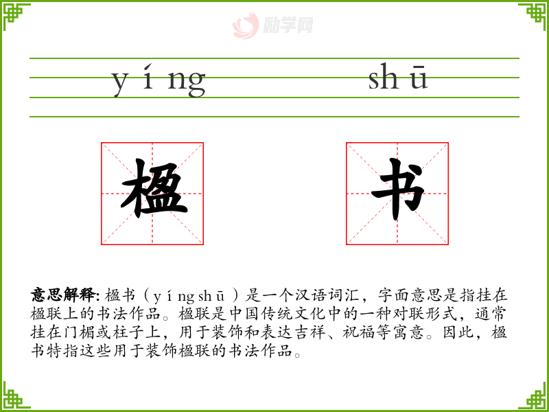 - 春节期间,家家户户都会挂上新的楹书,增添节日气氛。