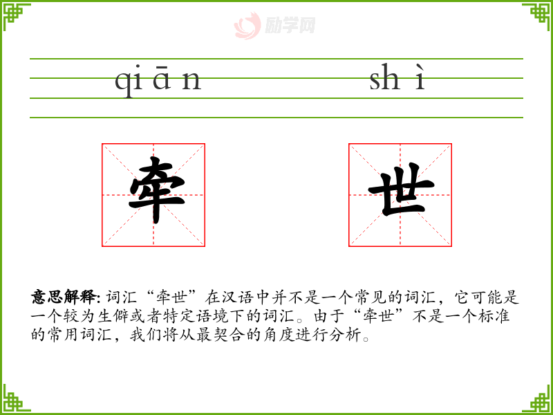 总结来说,“牵世”不是一个常用词汇,其具体含义和用法需要根据具体语境来确定。在语言学*和表达中,了解和掌握常用词汇更为重要。