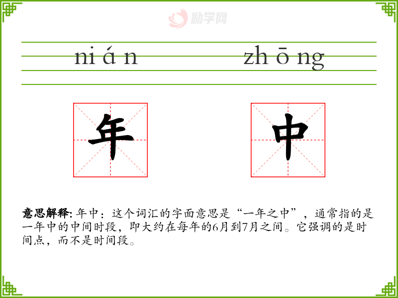年中:这个词汇的字面意思是“一年之中”,通常指的是一年中的中间时段,即大约在每年的*月到7月之间。它强调的是时间点,而不是时间段。