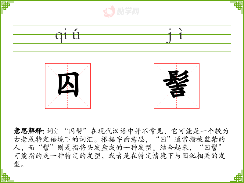 - 反义词:无(由于“囚髻”的特殊性,很难找到直接的反义词)