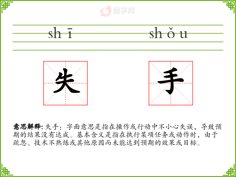 失手:字面意思是指在操作或行动中不小心失误,导致预期的结果没有达成。基本含义是指在执行某项任务或动作时,由于疏忽、技术不熟练或其他原因而未能达到预期的效果或目标。