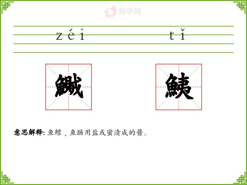 鱡鮧的意思是:鱼鳔﹑鱼肠用盐或蜜渍成的酱。