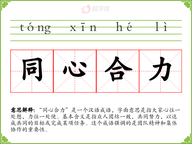 “同心合力”是一个汉语成语,字面意思是指大家心往一处想,力往一处使。基本含义是指众人团结一致,共同努力,以达成共同的目标或完成某项任务。这个成语强调的是团队精神和集体协作的重要性。