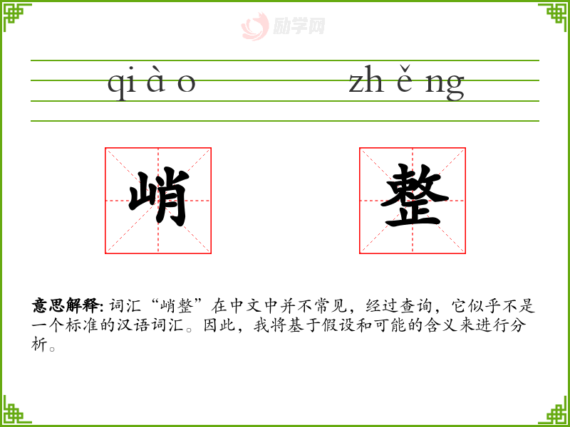 词汇“峭整”在中文中并不常见,经过查询,它似乎不是一个标准的汉语词汇。因此,我将基于假设和可能的含义来进行分析。