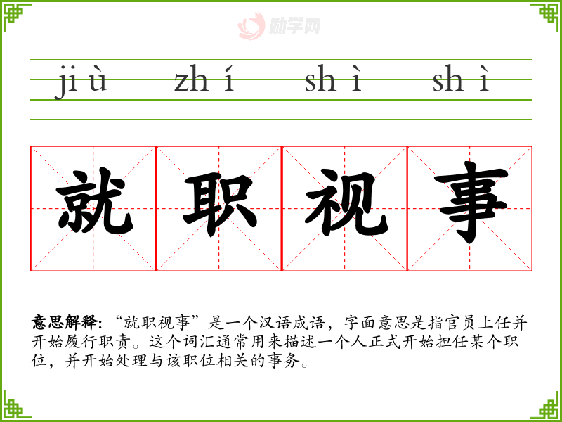 “就职视事”是一个汉语成语,字面意思是指官员上任并开始履行职责。这个词汇通常用来描述一个人正式开始担任某个职位,并开始处理与该职位相关的事务。