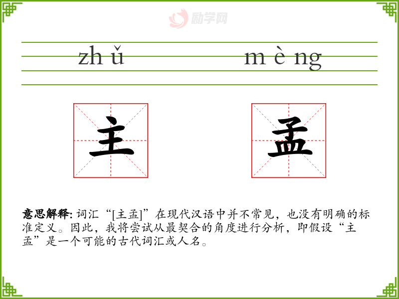 词汇“[主孟]”在现代汉语中并不常见,也没有明确的标准定义。因此,我将尝试从最契合的角度进行分析,即假设“主孟”是一个可能的古代词汇或人名。