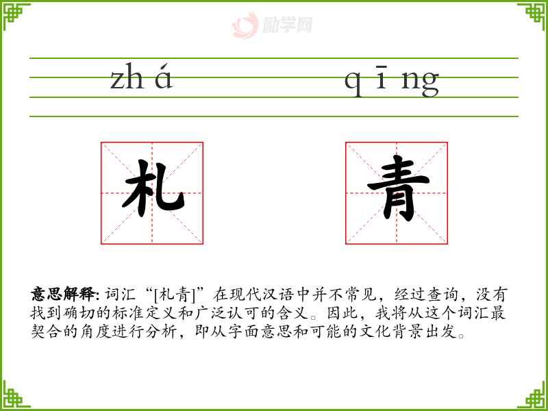 词汇“[札青]”在现代汉语中并不常见,经过查询,没有找到确切的标准定义和广泛认可的含义。因此,我将从这个词汇最契合的角度进行分析,即从字面意思和可能的文化背景出发。