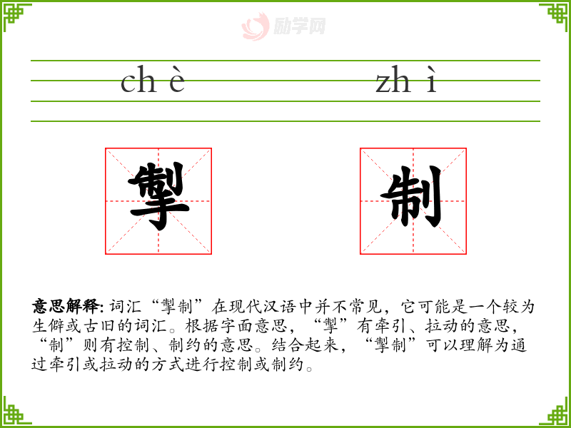 词汇“掣制”在现代汉语中并不常见,它可能是一个较为生僻或古旧的词汇。根据字面意思,“掣”有牵引、拉动的意思,“制”则有控制、制约的意思。结合起来,“掣制”可以理解为通过牵引或拉动的方式进行控制或制约。