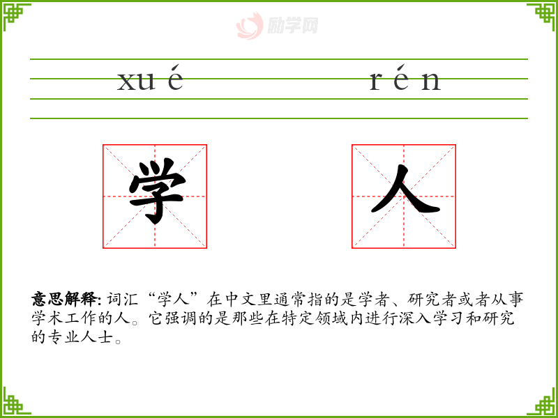 词汇“学人”在中文里通常指的是学者、研究者或者从事学术工作的人。它强调的是那些在特定领域内进行深入学*和研究的专业人士。