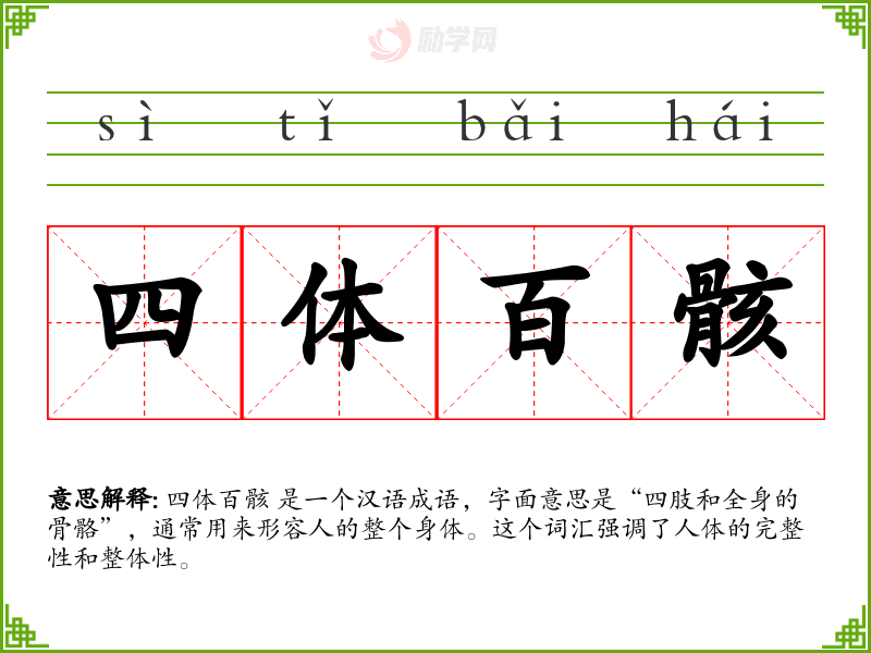 四体百骸 这个词汇源自古代汉语,其中“四体”指的是四肢,“百骸”指的是全身的骨骼。在古代文献中,这个词汇常用来形容人的身体或身体的某一部分。