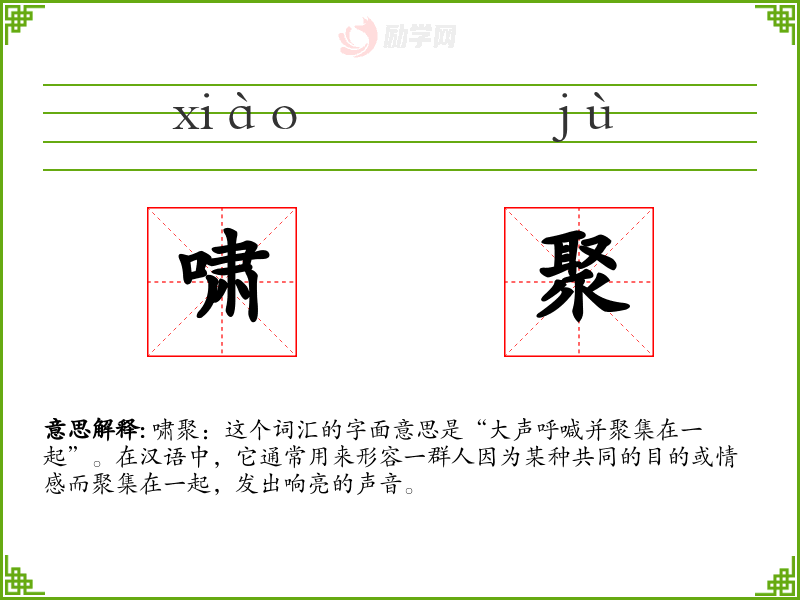 啸聚:这个词汇的字面意思是“大声呼喊并聚集在一起”。在汉语中,它通常用来形容一群人因为某种共同的目的或情感而聚集在一起,发出响亮的声音。