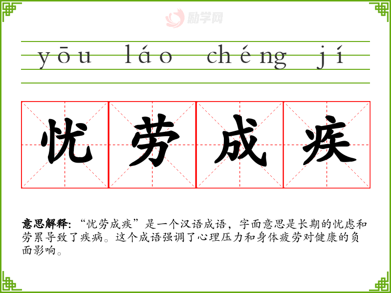 “忧劳成疾”是一个汉语成语,字面意思是长期的忧虑和劳累导致了疾病。这个成语强调了心理压力和身体疲劳对健康的负面影响。