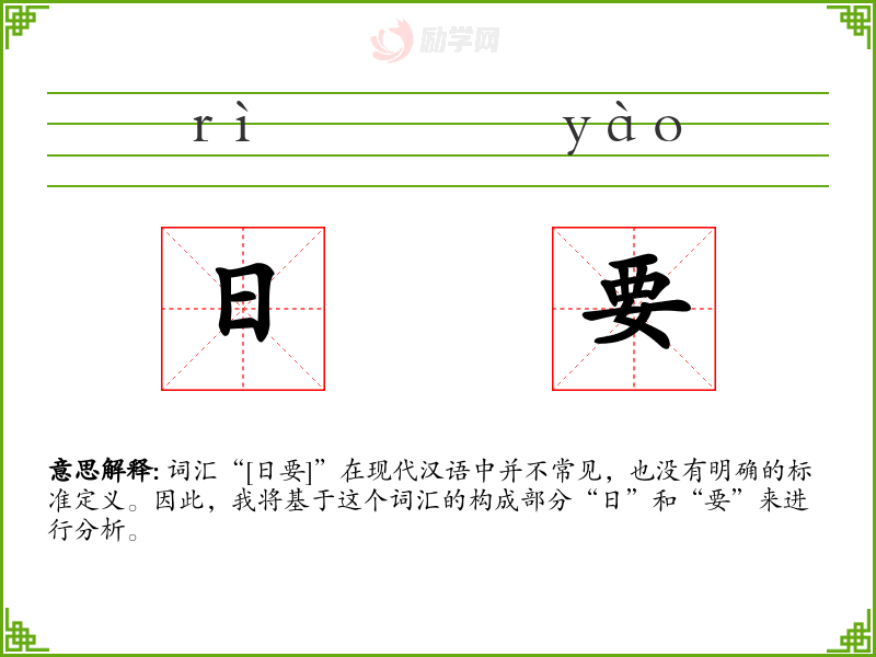 词汇“[日要]”在现代汉语中并不常见,也没有明确的标准定义。因此,我将基于这个词汇的构成部分“日”和“要”来进行分析。