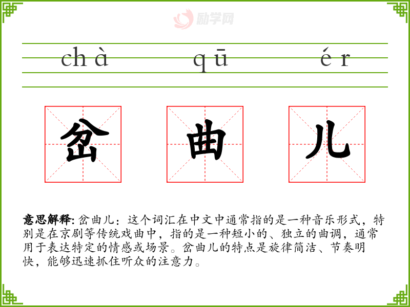 岔曲儿:这个词汇在中文中通常指的是一种音乐形式,特别是在京剧等传统戏曲中,指的是一种短小的、独立的曲调,通常用于表达特定的情感或场景。岔曲儿的特点是旋律简洁、节奏明快,能够迅速抓住听众的注意力。