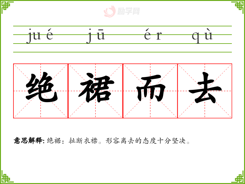 绝裙而去的意思是:绝裾:扯断衣襟。形容离去的态度十分坚决。