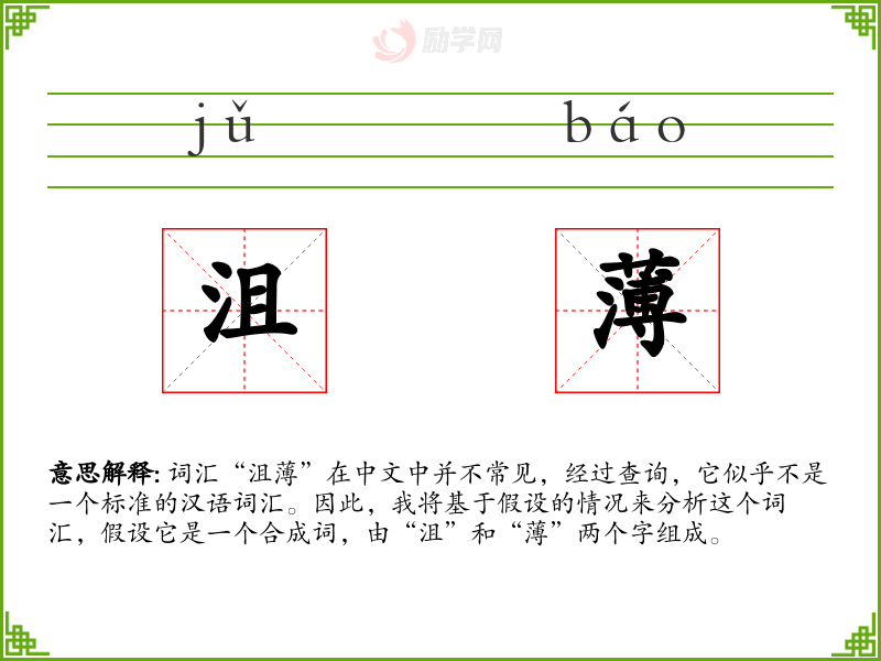 词汇“沮”在中文中并不常见,经过查询,它似乎不是一个标准的汉语词汇。因此,我将基于假设的情况来分析这个词汇,假设它是一个合成词,由“沮”和“”两个字组成。