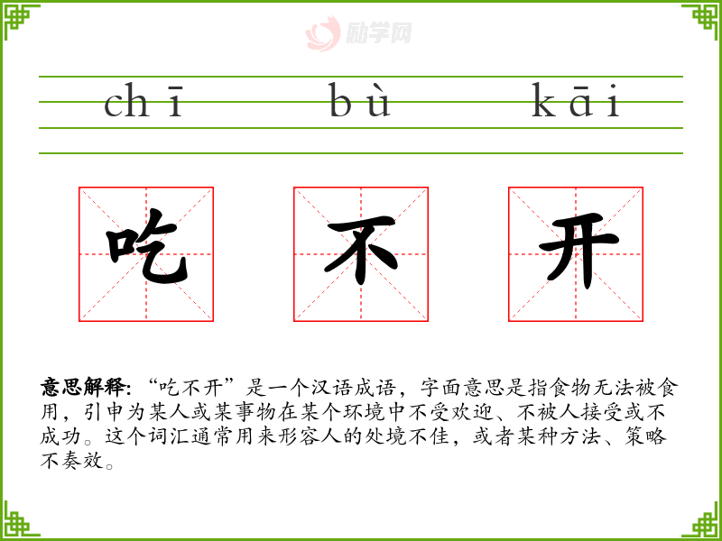 “吃不开”是一个汉语成语,字面意思是指食物无法被食用,引申为某人或某事物在某个环境中不受欢迎、不被人接受或不成功。这个词汇通常用来形容人的处境不佳,或者某种方法、策略不奏效。