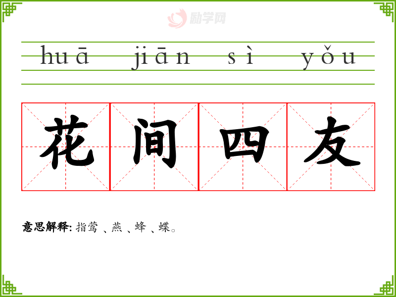 花间四友的意思是:指莺﹑燕﹑蜂﹑蝶。