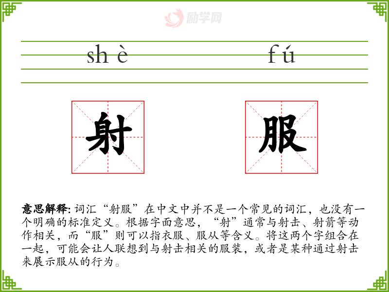 由于“射服”不是一个标准词汇,我们无法给出一个确切的基本定义。它可能是一个特定领域或特定社群中使用的术语,或者是某个特定情境下的临时组合词。