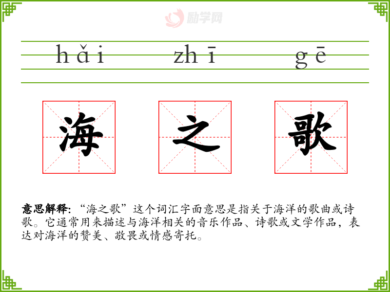 “海之歌”这个词汇字面意思是指关于海洋的歌曲或诗歌。它通常用来描述与海洋相关的音乐作品、诗歌或文学作品,表达对海洋的赞美、敬畏或情感寄托。