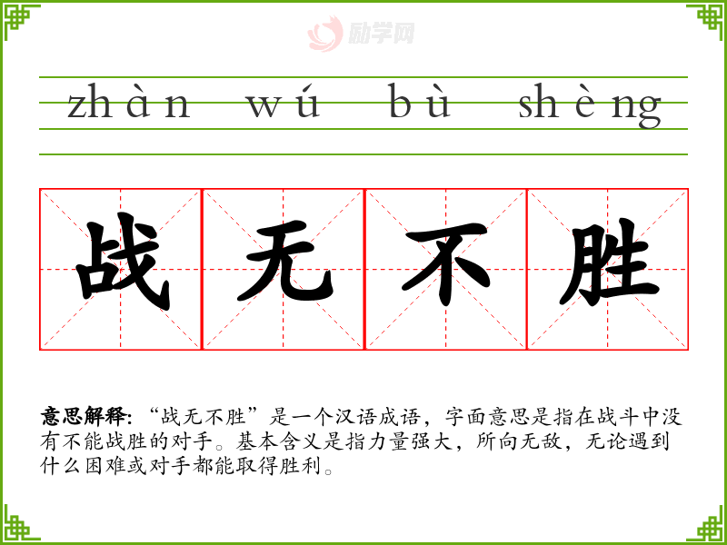 “战无不胜”是一个汉语成语,字面意思是指在战斗中没有不能战胜的对手。基本含义是指力量强大,所向无敌,无论遇到什么困难或对手都能取得胜利。