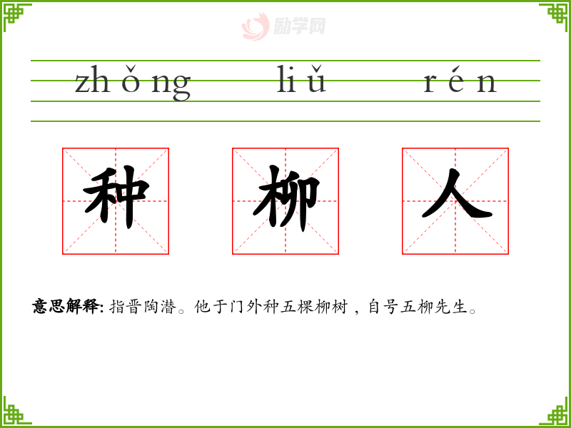 种柳人的意思是:指晋陶潜。他于门外种五棵柳树﹐自号五柳先生。