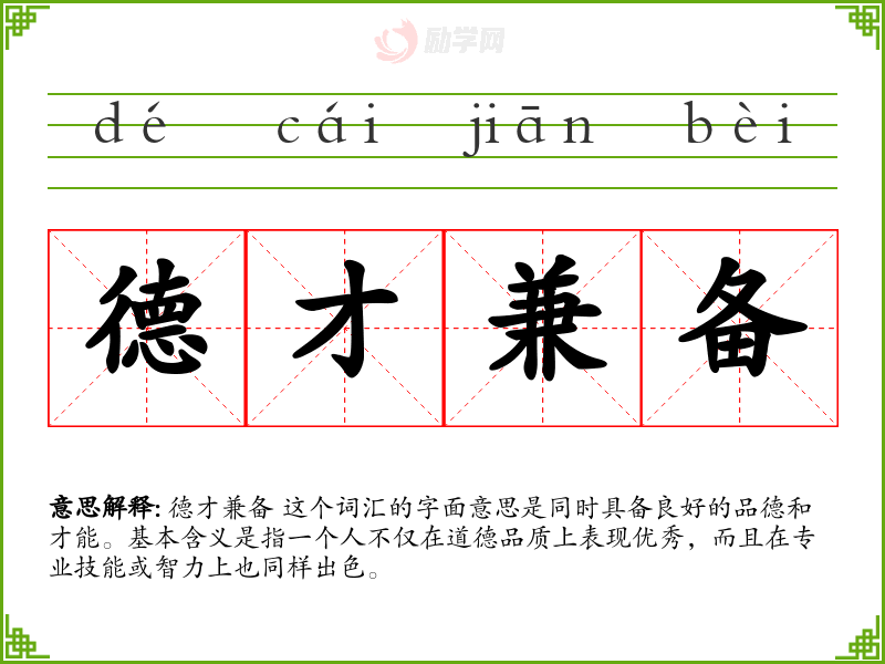 德才兼备 这个词汇的字面意思是同时具备良好的品德和才能。基本含义是指一个人不仅在道德品质上表现优秀,而且在专业技能或智力上也同样出色。