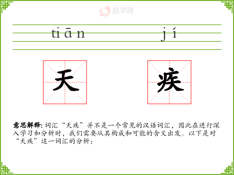 词汇“天疾”并不是一个常见的汉语词汇,因此在进行深入学*和分析时,我们需要从其构成和可能的含义出发。以下是对“天疾”这一词汇的分析: