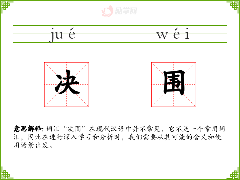 词汇“决围”在现代汉语中并不常见,它不是一个常用词汇,因此在进行深入学习和分析时,我们需要从其可能的含义和使用场景出发。