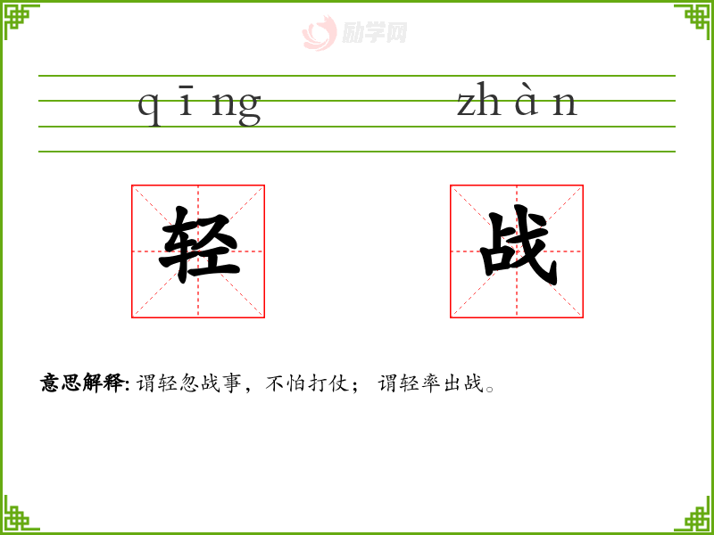 轻战的意思是:谓轻忽战事,不怕打仗; 谓轻率出战。
