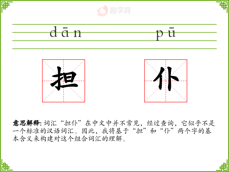 词汇“担仆”在中文中并不常见,经过查询,它似乎不是一个标准的汉语词汇。因此,我将基于“担”和“仆”两个字的基本含义来构建对这个组合词汇的理解。