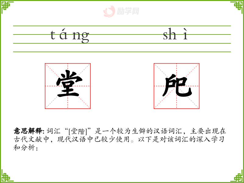 词汇“[堂階]”是一个较为生僻的汉语词汇,主要出现在古代文献中,现代汉语中已较少使用。以下是对该词汇的深入学*和分析: