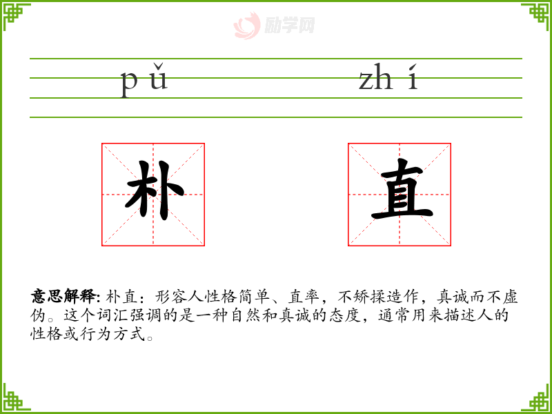 朴直:形容人性格简单、直率,不矫揉造作,真诚而不虚伪。这个词汇强调的是一种自然和真诚的态度,通常用来描述人的性格或行为方式。