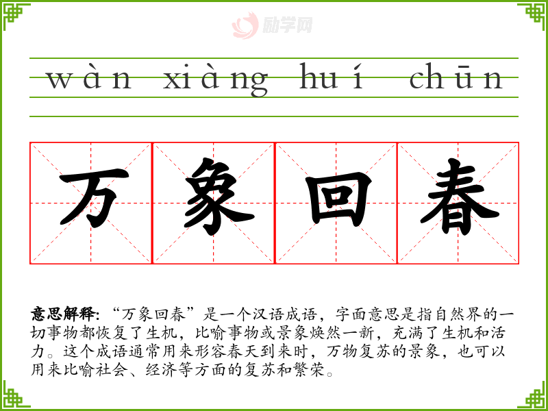 “万象回春”这个成语不仅描绘了自然界的美丽景象,也寓意着希望和新生。在语言学*和表达中,它是一个富有诗意和哲理的词汇,能够丰富我们的表达和理解。