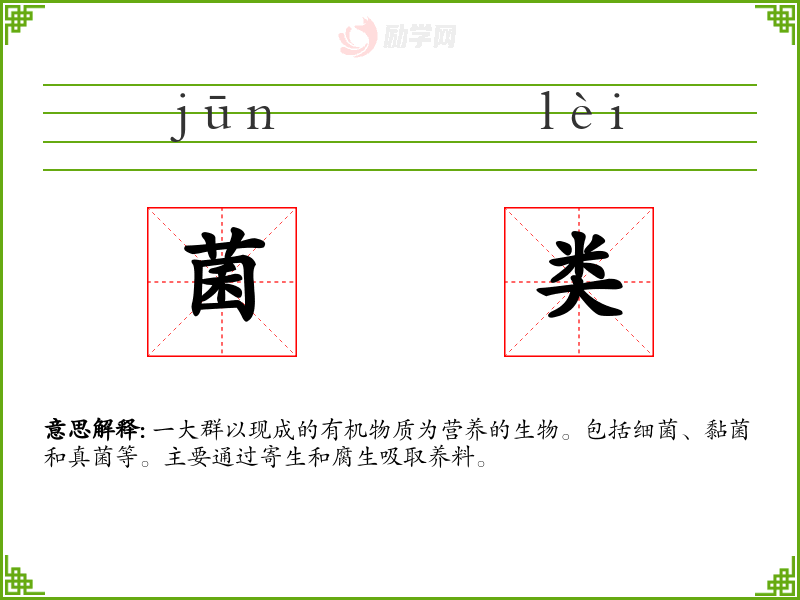 菌类的意思是:一大群以现成的有机物质为营养的生物。包括细菌、黏菌和真菌等。主要通过寄生和腐生吸取养料。
