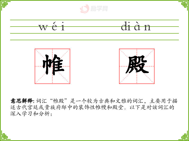 词汇“帷殿”是一个较为古典和文雅的词汇,主要用于描述古代宫廷或贵族府邸中的装饰性帷幔和殿堂。以下是对该词汇的深入学*和分析:
