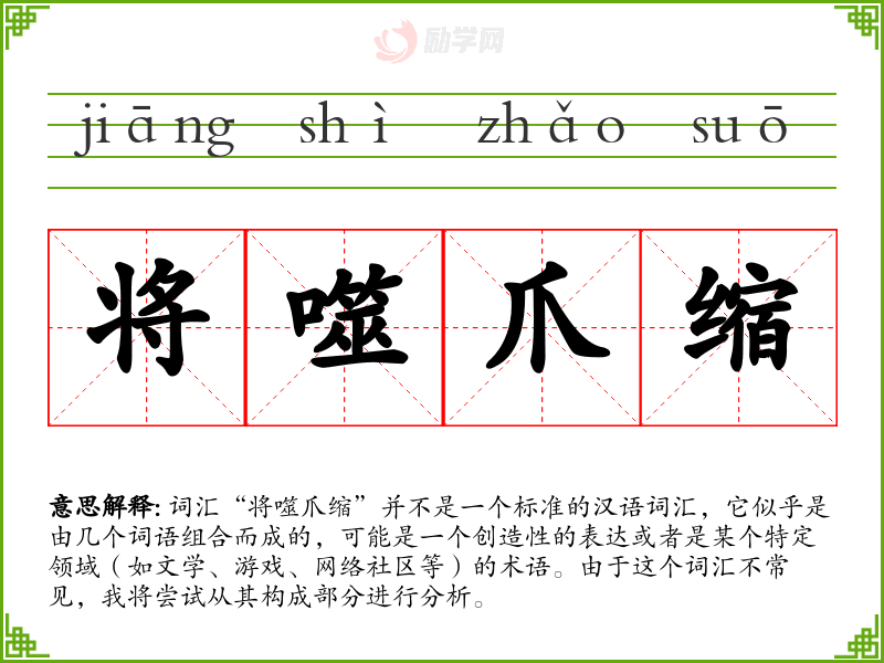 词汇“将噬爪缩”并不是一个标准的汉语词汇,它似乎是由几个词语组合而成的,可能是一个创造性的表达或者是某个特定领域(如文学、游戏、网络社区等)的术语。由于这个词汇不常见,我将尝试从其构成部分进行分析。