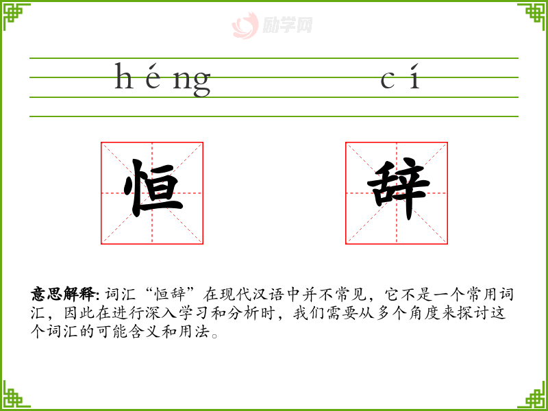 词汇“恒辞”在现代汉语中并不常见,它不是一个常用词汇,因此在进行深入学习和分析时,我们需要从多个角度来探讨这个词汇的可能含义和用法。