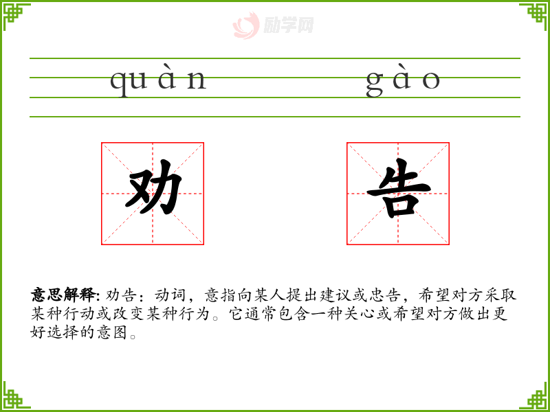 - 词源:劝告一词源自古代汉语,由“劝”和“告”两个字组成。劝字本义为鼓励、劝说,告字本义为告诉、通知。