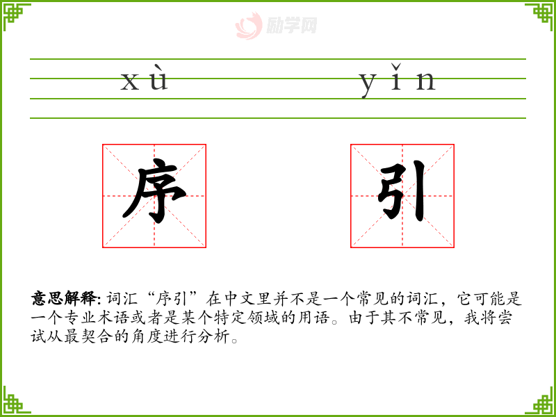 词汇“序引”在中文里并不是一个常见的词汇,它可能是一个专业术语或者是某个特定领域的用语。由于其不常见,我将尝试从最契合的角度进行分析。