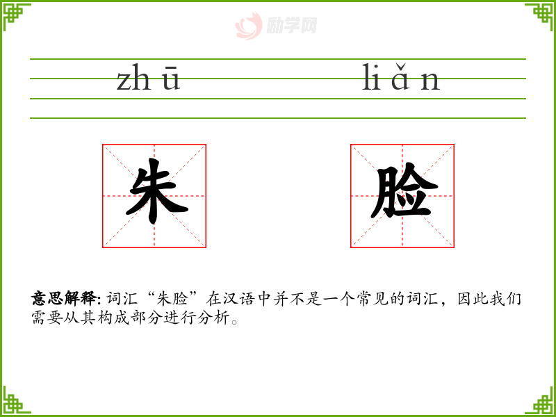 词汇“朱脸”在汉语中并不是一个常见的词汇,因此我们需要从其构成部分进行分析。