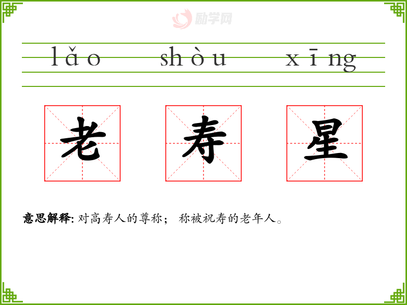 老寿星的意思是:对高寿人的尊称; 称被祝寿的老年人。