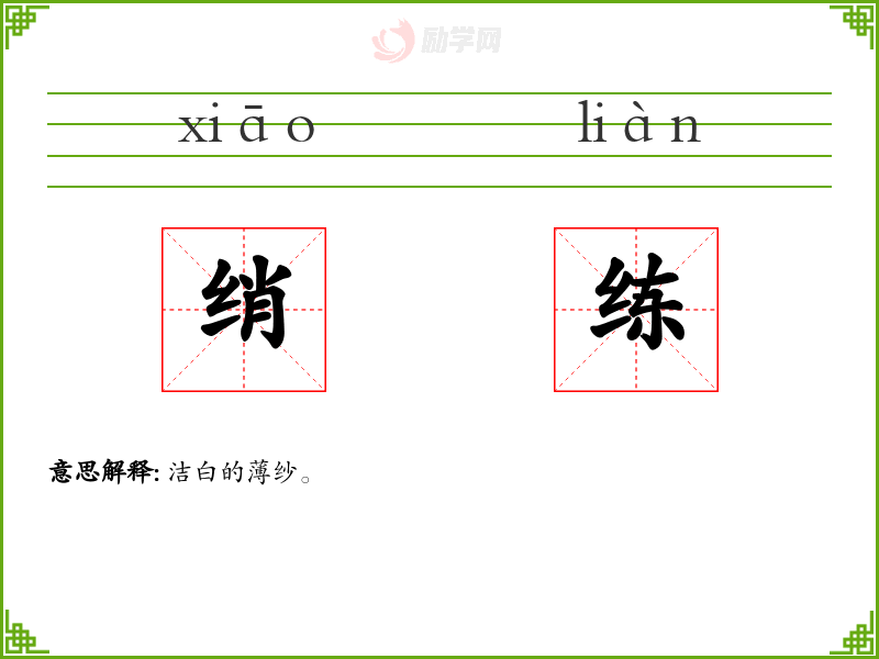 (形声。从糸,肖声。本义:生丝或以生丝织成的薄绸子) 同本义。