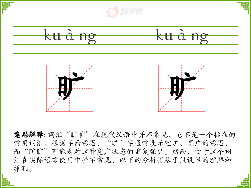 词汇“旷旷”在现代汉语中并不常见,它不是一个标准的常用词汇。根据字面意思,“旷”字通常表示空旷、宽广的意思,而“旷旷”可能是对这种宽广状态的重复强调。然而,由于这个词汇在实际语言使用中并不常见,以下的分析将基于假设性的理解和推测。