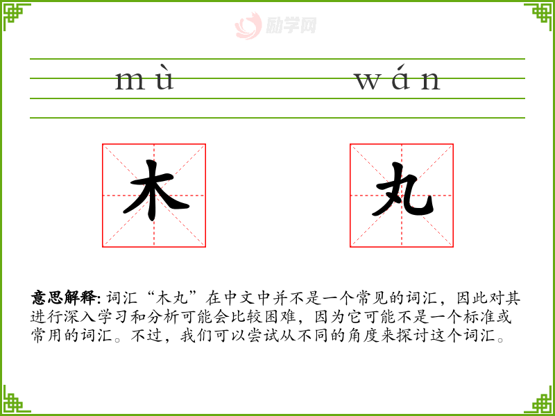 总的来说,“木丸”是一个不常见的词汇,其含义和用法可能需要更多的上下文来确定。在语言学习和表达中,它可能不是一个重要的词汇,但对于特定社群或文化来说,它可能有其独特的意义和价值。