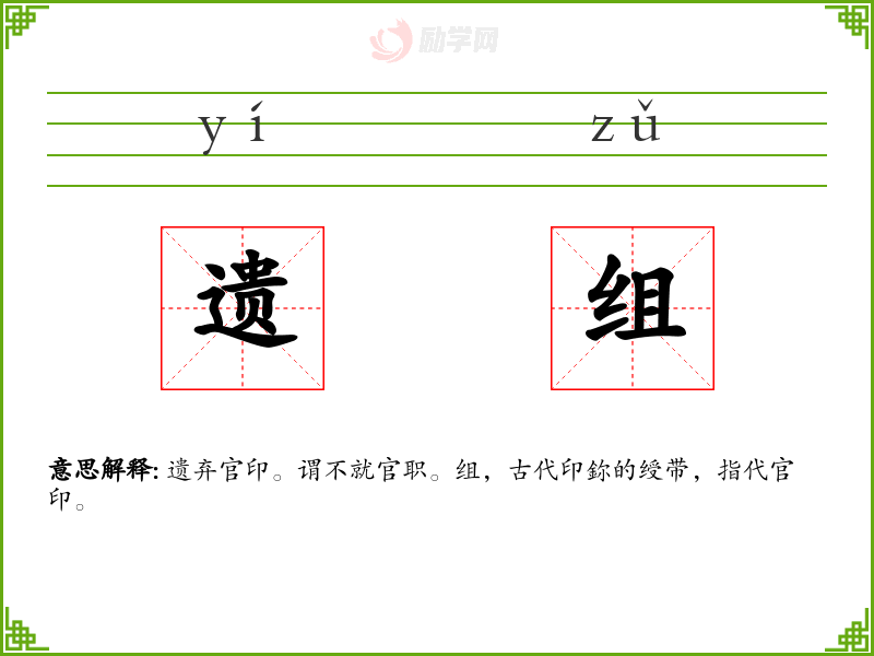 遗组的意思是:遗弃官印。谓不就官职。组,古代印鉨的绶带,指代官印。