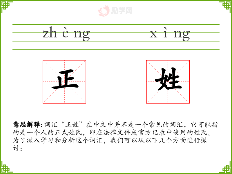 词汇“正姓”在中文中并不是一个常见的词汇,它可能指的是一个人的正式姓氏,即在法律文件或官方记录中使用的姓氏。为了深入学*和分析这个词汇,我们可以从以下几个方面进行探讨: