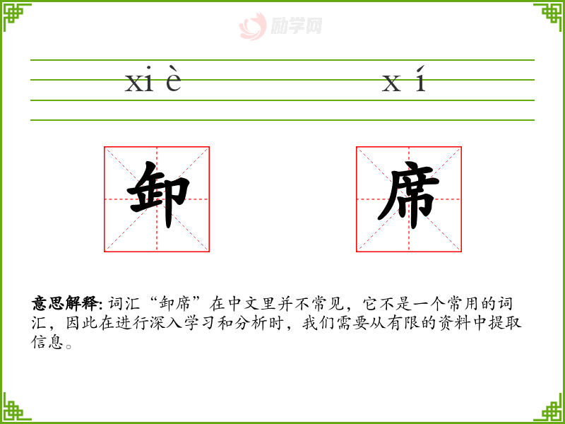 词汇“卸席”在中文里并不常见,它不是一个常用的词汇,因此在进行深入学*和分析时,我们需要从有限的资料中提取信息。