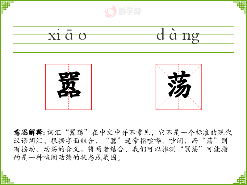 - “嚣荡”这个词汇虽然不常见,但它提供了一种描述喧闹动荡状态的方式。在语言学习和表达中,了解这样的词汇可以帮助我们更丰富地表达复杂的场景和情感。