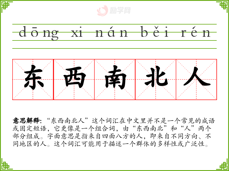 通过对“东西南北人”这个词汇的深入学,我更加理解了它在描述多样性和包容性方面的作用。在语言学和表达中,这个词汇帮助我更好地理解和表达社会的多元化现象。